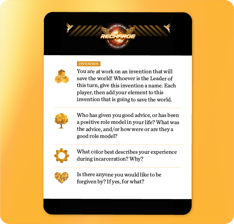 RECHARGE – Beyond the Bars Game is a digital game designed to help incarcerated people as well as formerly incarcerated people and their families to reflect on many aspects of their life and incarceration experiences. Recharge provides a structured, engaging and even fun way to communicate while bonding and growing in understanding, connection and empathy. Resulting in strengthening and healing lives and relationships.